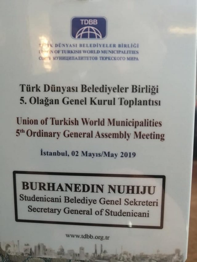 Sekretari i Komunës së Studeniçanit z. Burhanedin Nuhiju dhe udhëheqësi i njësisë për çështje financiare z. Nuri Sadiki marin pjesë në Asamblenë e përgjithshme të Unionit Botëror të Komunave Turke (TDBB) që po mbahet nga data 01-03 maj në Stamboll, Turqi.